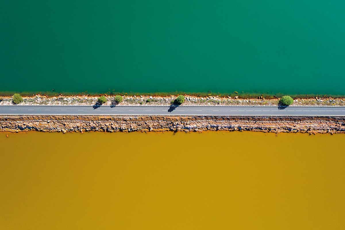 (Above) PHOTO INFO: Roberto Bueno: Life, A Thin Line 2 (2019) “a raised road divides green, fresh water from a reservoir of toxic ochre-coloured mining waste water. The photographer’s love of nature began at a young age and was shaped by regular forays into Las Sierras de Béjar y Francia biosphere reserve near his home in Salamanca province in western Spain.